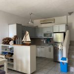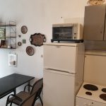 Apartman broj 1 raspolaže sa spavaćom sobom, kuhinjom, kupatilom i terasom (bočni pogled više). U sobi se nalaze dva singl ležaja, au kuhinjskom delu se nalazi sofa na razvlačenje. Kuhinjski deo sadrži veliki šporet sa četiri ringle i rernom i velikim frižiderom, sudoperu i elemente sa osnovnim kuhinjskim inventarom. Kupatilo ima tuš kadu. Peškiri, toalet papir i sapun nisu sastavni deo smeštajne jedinice. Apartman ima TV prijemnik sa grčkim kanalima, wifi i klima uredjaj. Smeštajni objekat nema obezbedjeno parking mesto.