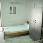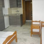 Vila Atos (Athos) se nalazi na samoj obali Nei Porija preko puta široke, peščane plaže. Dvokrevetni i trokrevetni studiji, sa francuskim ležajem po grčkim standardima smešteni su na prvom i drugom spratu, iznad istoimenog restorana. Trokrevetni studiji imaju bočni pogled na more, dok dvokrevetni nemaju pogled na more. Sve smeštajne jedinice poseduju kuhinju, osnovno opremljenu: frižider, rešo, posuđe i escajg srazmerno broju ležajeva, kupatilo, terasu, TV i klima uređaj čije je korišćenje uključeno u cenu najma apartmana. Promena posteljine se vrši jedanput u toku boravka.